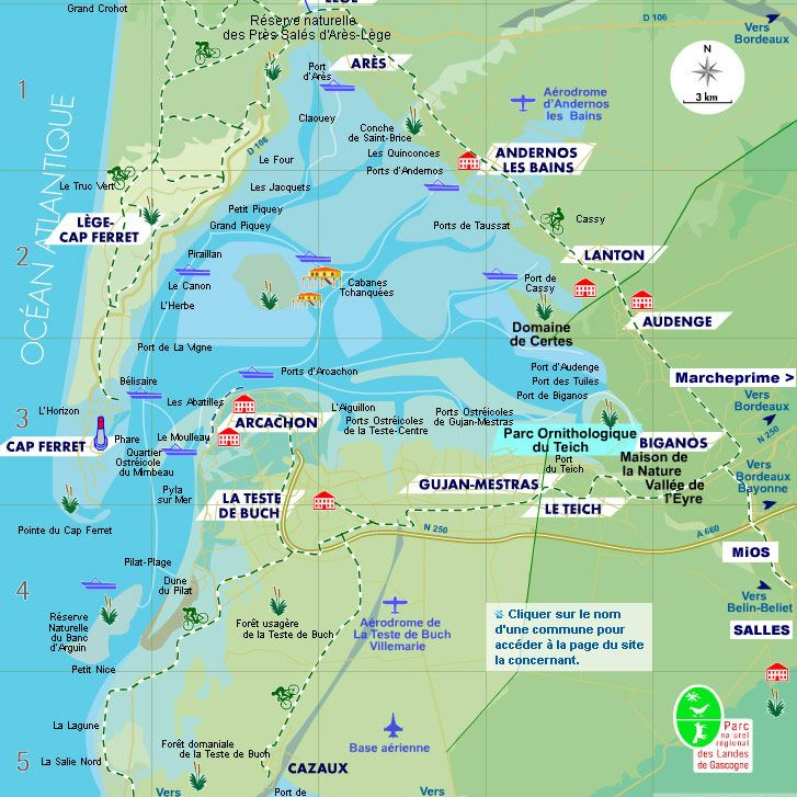 La circonférence du bassin commence au Pyla-sur-Mer - en allant du nord obliquement à l'est - puis au sud et de nouveau à l'est à La Teste-de-Buch. Il continue vers le nord-ouest au delta de la Leyle avant de redescendre vers le sud-ouest jusqu'au Cap Ferret, qui fait face au Pyla-sur-Mer. Au centre du bassin se trouve une île appelée l'île aux oiseaux et ses cabanes perchées sur pilotis. C'est le lieu idéal pour y passer son permis bateau.